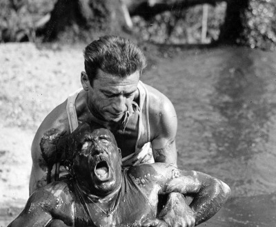The payoff amounts to a ticket out of Las Piedras; the suicidal drive is the ultimate test of machismo. Yet the world clearly belongs to SOC. Before the movie ends, Clouzot even finds a way to literally rub his antiheroes’ faces in the reality of petro-imperialism in a sequence involving real oil that Life called “just about the most gruesome scene ever seen on film” and now seems a precursor of Werner Herzog’s recontextualized Gulf War eco-disaster documentary, Lessons of Darkness (1992), which also featured a lake of oil and flaming oil wells fought with fire.