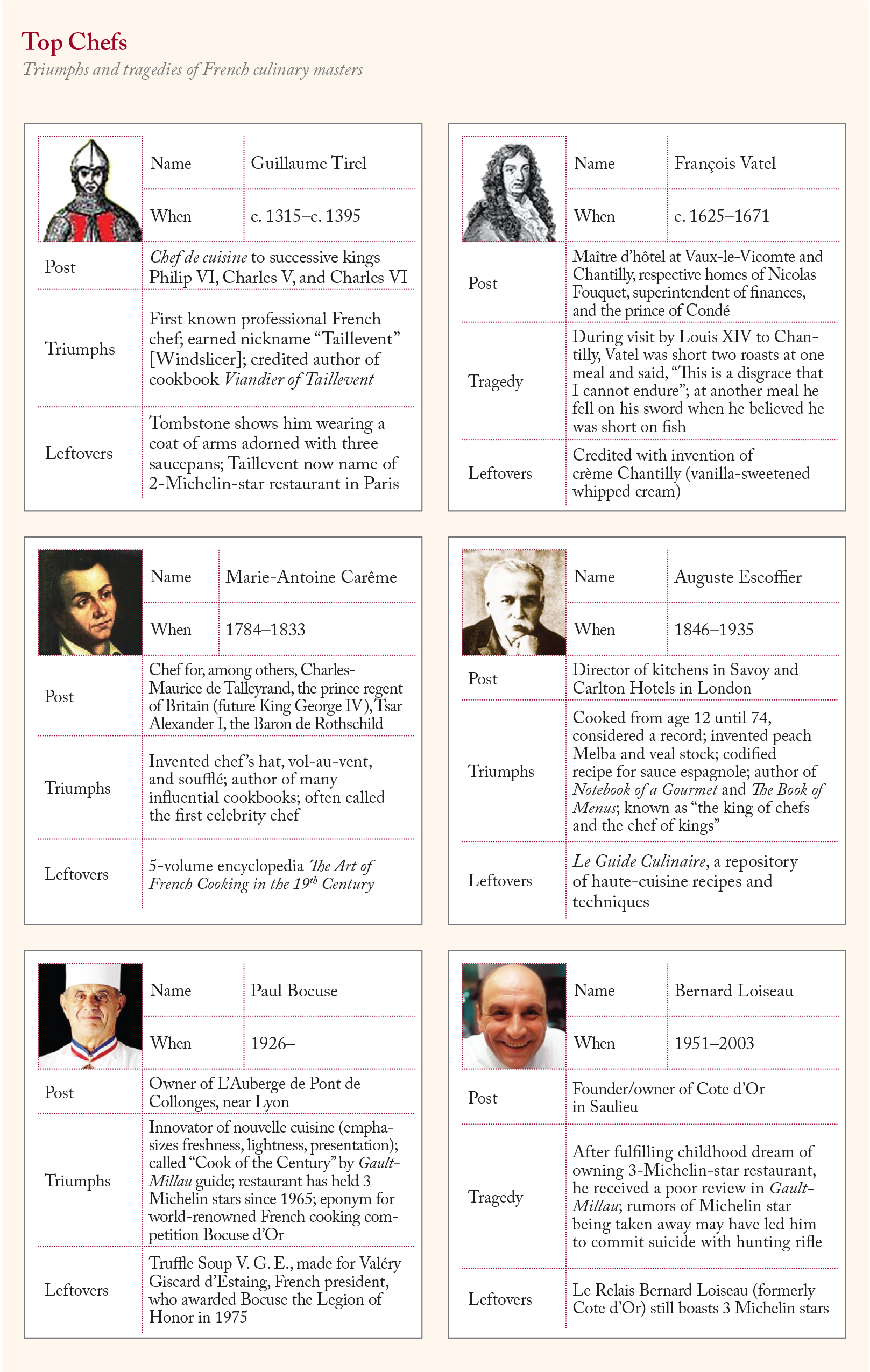 Triumphs and tragedies of French culinary masters.