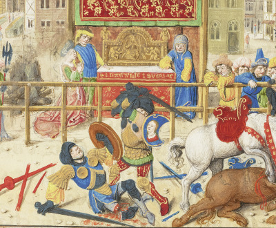 After many preliminary ceremonies decreed by tradition (an arms inspection, a series of solemn oaths, the requisite dubbing of Le Gris as a knight to make the combatants equal in rank, etc.), the duel began as a joust on horseback, with lances. The two combatants “sat their horses very prettily,” writes Froissart, “for both were skilled in arms. And the lords of France delighted to see it, for they had come to watch the two men fight.” Besides the resolution to a deadlocked legal case, the duel also provided eagerly anticipated blood sport for the nobility.